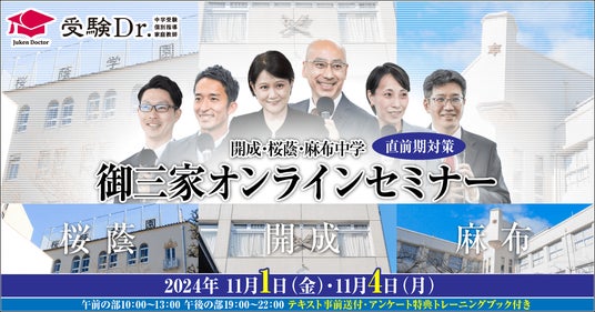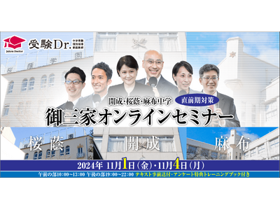 株式会社日本教育指導総合研究所JET(所在地:東京都新宿区、代表取締役:屋口 京子)が運営する中学受験専門の個別指導塾・家庭教師派遣の受験Dr.は、「御三家入試戦略セミナー(開成・桜蔭・麻布中学対象)」を、2024年11月1日(金)・4日(月)に開催する。