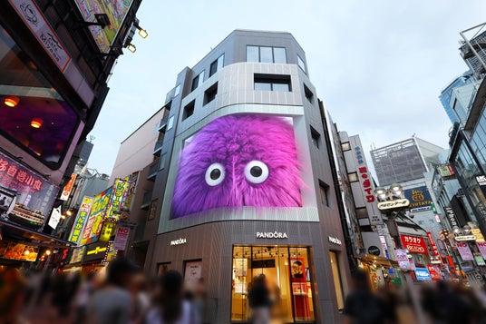 錯視3Dを利用した放映コンテンツ『モンスターアイ』は、渋谷センター街の新しいランドマークキャラクターとしてモンスターがビルに住んでいるかのように設計。
