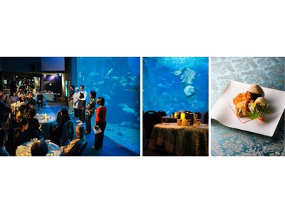 会場は水族館のメイン展示、「相模湾の海」を再現した相模湾大水槽前。相模湾で水揚げされた魚を使い、Chefs for the Blueのメンバーシェフが料理をつくり、新江ノ島水族館のトリーター(飼育員)がお客さまへのサービスやコミュニケーションを担当します。夜の水族館を「食を楽しむ場」に変え、魚を「見て楽しむ」対象としてだけでなく「知って考え、食べて楽しむ」対象と考える場とし、食事とともに、クロストークセッションもお楽しみいただきます。