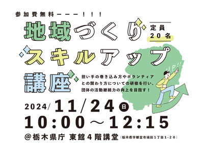 栃木県(県知事:福田富一)は、県内の地域づくりを実践する団体が継続的に運営を続けていくうえで必要な、活動の担い手の巻き込み方や、ボランティアとの関わり方についての研修を行います。本講座はNPO法人とちぎユースサポーターズネットワーク(代表理事:岩井俊宗)が事務局として運営補助を担います。