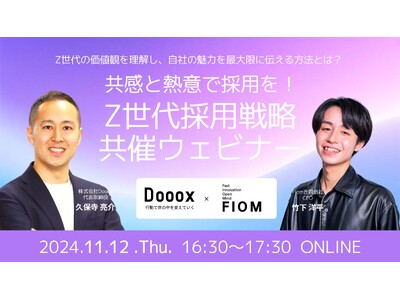Z世代向けクリエイティブカンパニーFiom合同会社(本社:東京都渋谷区、代表社員:竹下洋平)は、株式会社Dooox(本社:東京都千代田区、代表:久保寺亮介)と共同で、2024年11月12日(火)16:30から「共感と熱意で採用を!Z世代採用戦略共催ウェビナー」をテーマにオンラインセミナーを開催いたします。本ウェビナーではZ世代に向けた具体的な採用手法や前提として採用をする意義など組織においてなぜ採用が重要なのかということをお伝えいたします。
