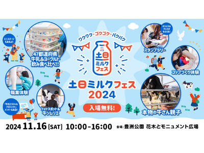 『ワクワク・ゴクゴク・パクパク 土日ミルクフェス2024』と題したイベントを11月16日(土)、東京都江東区の豊洲公園で開催します。全国の酪農乳業関係者やミルクファンらが一体となり、国産の牛乳・乳製品の楽しみ方や酪農乳業の魅力などについて五感で体験できる親子向けのイベントです。2.3万人が来場した昨年に続き2回目となります。今年は新たなブースやステージコンテンツを用意するなど、内容を一層充実させます。