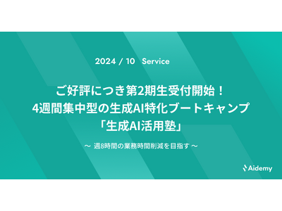 デジタル変革に伴走する株式会社アイデミー(本社:東京都千代田区、代表取締役 執行役員 社長 石川聡彦、以下「アイデミー」)は、4週間集中型の生成AI特化ブートキャンプ「生成AI活用塾」を2024年10月より開講しておりますが、ご好評につき第2期生の登録受付を、2024年10月24日より開始いたしました。