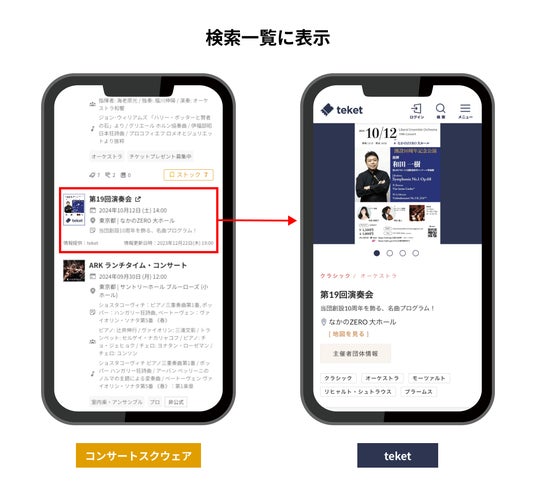 検索一覧からteketへコンサートスクウェアのコンサート情報と同様に、検索し、一覧で探すことができます。