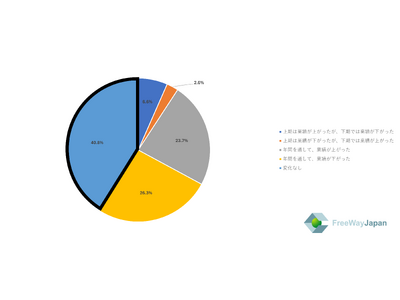 代表取締役の方に、今年度の上期と下期で業績に変化はあったか聞いたところ、「変化なし」が40.8%で最も多く、次いで「年間を通して、業績が下がった」が26.3%、「年間を通して、業績が上がった」が23.7%、「上期は業績が上がったが、下期では業績が下がった」が6.6%、「上期は業績が下がったが、下期では業績が上がった」が2.6%という結果だった。