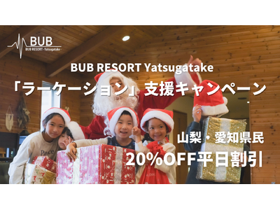 株式会社BUB(東京都品川区、代表取締役:一戸 悠人)が運営するBUB RESORT Yatsugatake(山梨県北杜市)は、山梨県の「県民の日」と、愛知県の「あいち県民の日」の祝福に加え、愛知発の学び方「ラーケーション」(LearningとVacationの融合)を支援するため、宿泊特典をご用意いたしました。2024年11月18日(月)から2024年11月29日(金)までの2週間限定(※11月22日(金)、23日(土)のチェックインを除く)で、山梨県・愛知県在住の方に限り、20%OFFでご宿泊いただけます。