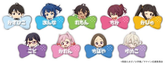 温水和彦、八奈見杏菜、焼塩檸檬、小鞠知花、温水佳樹、月之木古都、姫宮華恋、朝雲千早、志喜屋夢子の総勢9名のミニキャラです。