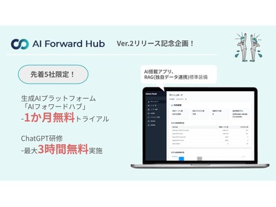 業務効率化の最前線!1か月間の無料トライアルと特別研修を先着5社に無償提供!「AIフォワードハブ」Ver.2アップデート記念。セキュアな環境でAI搭載アプリと独自データ連携(RAG)を標準装備。