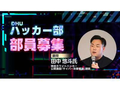 文部科学省認可の株式会社立の大学として、デジタルコンテンツと企画・コミュニケーションを学ぶデジタルコミュニケーション学部(4年制大学)と、理論と実務を架橋し新たなビジネスを生み出すデジタルコンテンツ研究科(専門職大学院)を設置するデジタルハリウッド大学(DHU、所在地 東京・御茶ノ水、学長 杉山知之)では、近年、世界中で急速に需要が高まっているホワイトハッカー育成について、新たな知識・技術・価値を創造していくことを目指し、ハッカーとして活躍する田中悠斗氏を迎え、「ハッカー部」を創設いたします。