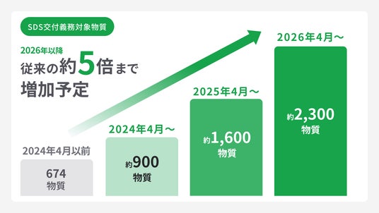 2024年4月に労働安全衛生法施行令の一部が改正され、SDS(安全データシート)作成が義務付けられる対象物質が新たに234物質追加、合計約900物質となりました。なお、SDSとはSafety Data Sheet(安全データシート)の略称で、化学品の危険有害性や適用法令を定めた、いわば化学品の取扱説明書のようなものです。2025年にはさらに約700物質、2026年には約850物質がSDS交付義務対象となり、現在の約5倍まで増加することが確定しています。