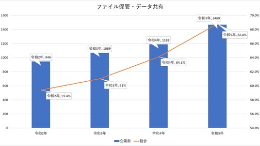 こちらのグラフでも確認できるように、令和2年~令和5年のファイル保管・データ共有をクラウドで行っている企業数は、3年間でおよそ500企業増えております。割合で見てもおよそ10%増加しており、7割近くの企業はファイル保管・データ共有をクラウドで行っていることになります。