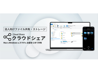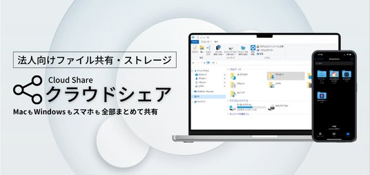 「クラウドシェア」は、法人向けに作られた、ファイル共有やデータ共有、クラウドストレージ等として利用できるクラウドサービス。ご利用いただける端末は、Windows PCやMacBook、スマートフォンなど、端末を問わずご利用いただけます。