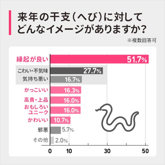 ソルトワークスが2024年9月に行ったアンケート調査(※1)では、9割以上の人が年賀状のデザインに干支のイラストや写真を入れると回答。年賀状に干支はマストな存在であるといえます。しかし、来年の干支ヘビに対してのイメージは、約半数の51.7%が「縁起が良い」と回答する一方で、「かっこいい」「高貴・上品」といったプラスイメージをおさえて「こわい」「気持ち悪い」といったマイナスイメージを持つ人が多いことがわかりました。これらの結果を踏まえ、「つむぐ年賀」ではヘビが苦手な方でも選びやすいテンプレートやスタンプ素材を充実させました。