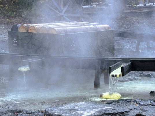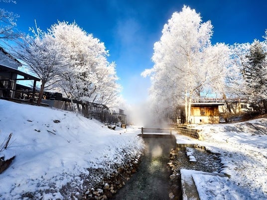 冬には湯けむりが木の枝先に氷の結晶を葉につけ、幻想的な景色が生まれる