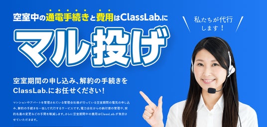 従来、不動産管理会社様は、空室の通電業務は煩雑になりやすくコストパフォーマンスが悪い、という課題を抱えていました。その解決策として提供するこの『空室通電サービス』は、導入することで電力会社からの納付書の管理や契約名義の変更をする必要がなくなります。さらに、空室期間中の電気料金等の費用はClassLab.が負担させていただきますので、マンションの空室管理が効率的になるだけでなくコストカットも同時に叶います。