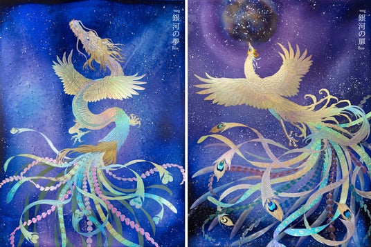 龍と鳳凰が翼を広げ、自由自在に宇宙を飛翔する姿が描かれたこの連作は、大自然や宇宙といった広大で調和の取れた世界での《自由なるいのち》を象徴しています。