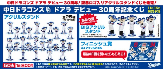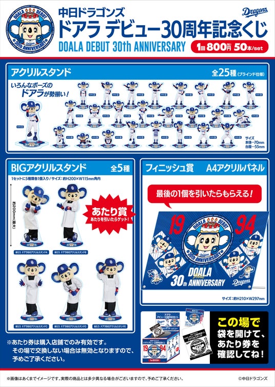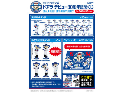 今年デビュー30周年を迎えたマスコット「ドアラ」の様々なポーズのアクリルスタンドを収録した「中日ドラゴンズ ドアラ デビュー30周年記念くじ」が登場!