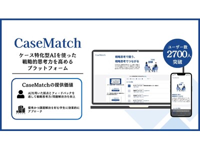 CaseMatchは東京一工早慶の学生を中心に2700名以上が利用し、毎週コンペティション形式でケース問題を出題しているケース対策プラットフォームです。学生はケース問題に筆記ベースで回答し、AIによる採点とフィードバックを通して戦略的思考力・問題解決能力を高められます。