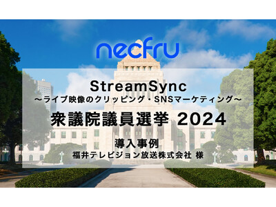 動画配信システムを展開している株式会社ネクフル(本社:東京都中央区 代表取締役:草薙俊介)は、生ライブ配信中の映像をクリップ切抜きするサービス「necfru StreamSync」を、福井テレビジョン放送株式会社様(本社:福井県福井市 代表取締役社長:酒井美樹男 以下:福井テレビという)にご提供し、同社による「第50回 衆議院議員総選挙 開票速報特別番組」(以下:同番組という)のライブ中継で採用されたことをご報告いたします。