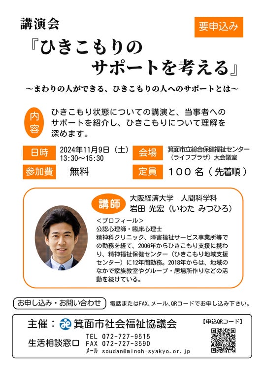 ひきこもり相談窓口では昨年に引き続き、ひきこもりに関する講演会を開催します。今回のテーマは「ひきこもりのサポートを考える」として、地域社会でひきこもり状態のかたをどう支えていくか等について、講師からの講演や講師とボランティアとの対談を通して理解を深めます。