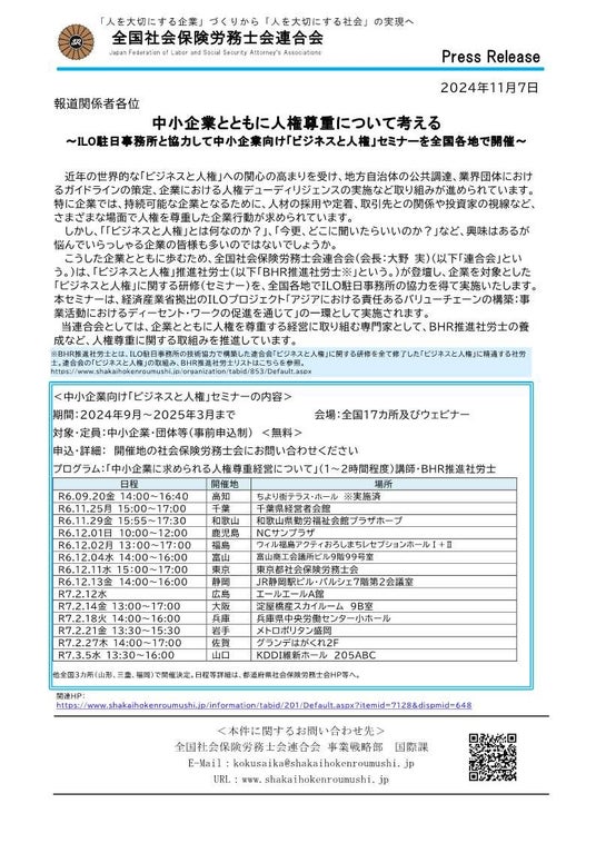 こうした企業とともに歩むため、全国社会保険労務士会連合会(会長:大野 実)(以下「連合会」という。)は、「ビジネスと人権」推進社労士(以下「BHR推進社労士※」という。)が登壇し、企業を対象とした「ビジネスと人権」に関する研修(セミナー)を、全国各地でILO駐日事務所の協力を得て実施いたします。本セミナーは、経済産業省拠出のILOプロジェクト「アジアにおける責任あるバリューチェーンの構築:事業活動におけるディーセント・ワークの促進を通じて」の一環として実施されます。