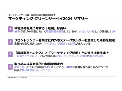 今回の調査結果から、マーケティング領域における環境配慮への意識と実践にはギャップがあり、業種・業界による違いはあるものの全体の取り組みが限定的であることが明らかになりました。