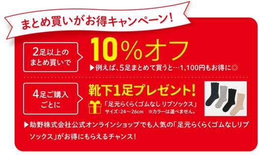 2足以上のまとめ買いで10%オフ、4足購入ごとに「足元らくらくゴムなしリブソックス」を1足プレゼント!お得なまとめ買いキャンペーンをお見逃しなく。