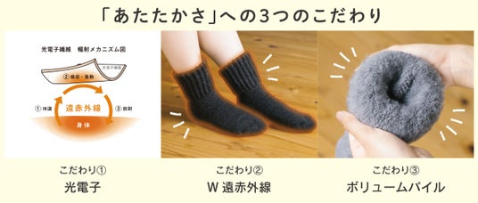 『あたたかさ』のこだわりでは体温域で効率よく「遠赤外線」をふく射する株式会社ファーベスト社の保温繊維「光電子」を使用。体温を利用して身体を保温するので自然なあたたかさが持続します。さらに遠赤外線効果に優れたアクリル素材セラフィ(TM)も使用することでW遠赤外線効果とふわふわのボリュームパイルが冷えた足もあたたかく包み込みます。