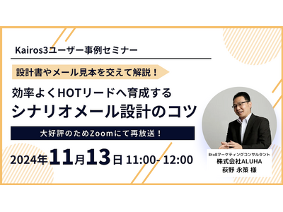 売上アップを仕組みで実現するCRM「Kairos3(カイロススリー)」を提供するカイロスマーケティング株式会社(本社:東京都渋谷区、代表取締役:佐宗 大介、以下「当社」)は、2024年8月に実施したオンラインセミナー「設計書やメール見本を交えて解説!効率よくHOTリードへ育成するシナリオメール設計のコツ」が好評だったことを受け、2024年11月13日(水)に再配信することを決定いたしました。
