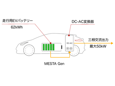 「MESTA Gen」は、EVの駆動用バッテリーから直接電力を取り出す独自技術を応用し、これまで誰もなしえなかったEVからの三相電力の供給を、しかも50kWという大出力で実現しています。
