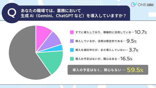 「あなたの職場では、業務において生成AI(Gemini、ChatGPTなど)を導入していますか?」という設問に対し、半数を超える59.5%が「導入の予定はなく、関心もない」と回答しており、