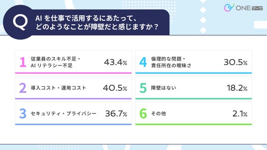 「AIを仕事で活用するにあたって、どのようなことが障壁だと感じますか?」という設問に対し、105名(43.4%)と最も多くの回答者が、従業員のスキル不足・AIリテラシー不足を障壁として挙げました。この結果は、