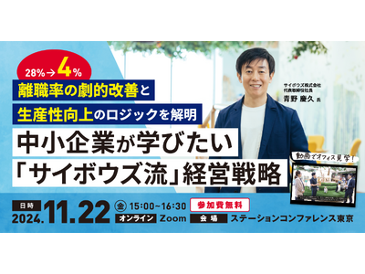 TOMAコンサルタンツグループ(東京都千代田区 代表 市原和洋)は、2024年11月22日(金)、サイボウズ株式会社 代表取締役社長 青野慶久氏を講師に迎え、TOMA特別講演会「離職率〈28%→4%〉の劇的改善と生産性向上のロジックを解明 『中小企業が学びたい サイボウズ流 経営戦略』」をハイブリッド形式で開催いたします。