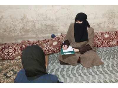 REALsの活動に参加し、避難生活を送る人を訪問して話を聞くコミュニティワーカー(奥)。自身避難民として暮らす。