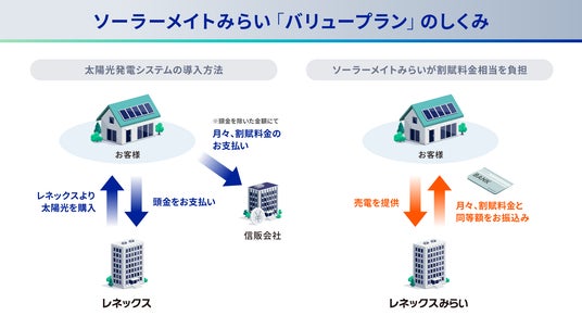 ハンファジャパン株式会社(所在地:東京都港区 代表取締役:尹 柱 以下、ハンファジャパン)の100%子会社「レネックス株式会社」(以下、レネックス)は、太陽光発電システムで日中に発電して使用した電力(自家消費分)にかかる電気代が0円※¹となり、さらに、太陽光発電システムの購入・設置費用の一部を頭金としてお支払いいただくことで、システムの購入・設置費用の残金も実質0円※²となる新サービス、ソーラーメイトみらい「バリュープラン」を、2024年11月中旬に発売いたします。