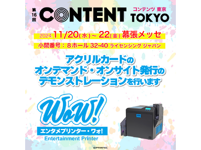 株式会社ジー・プリンテックは、11月20日(水)~22日(金)に幕張メッセで開催される展示会「第16回コンテンツ東京(ライセンシングジャパン)」に出展し、新商品「エンタメプリンター・ワォ! 透明アクリルカードプリンター」を発表展示します。エンタメプリンター・ワォ!は世界初※のオンデマンド・オンサイト発行可能なアクリルカードプリンターです。