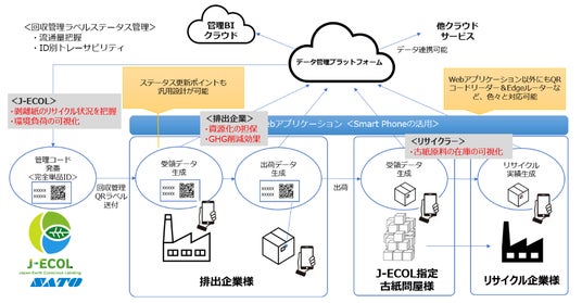 剥離紙の排出企業、古紙回収の中間処理企業、リサイクラー企業が連携して剥離紙の回収から再資源のスキームを実際に運用。回収から再資源化までの過程や資源量などをデジタル化し、データをクラウドシステムに蓄積・可視化してトレーサビリティを可能にします。また、取得データをもとに効率的なリサイクルに向けた運用の検証を行います。