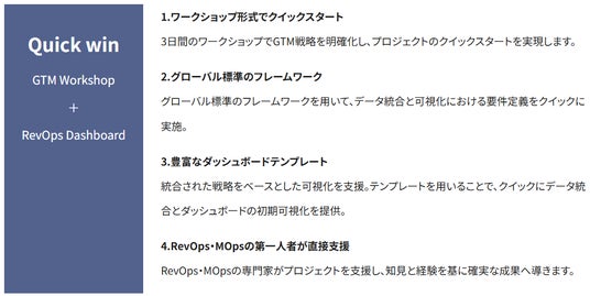 RevOpsは、レベニュー組織のデータ統合と管理体制を強化し、データに基づく一貫した顧客体験の提供や迅速な意思決定を可能にすることで、様々な価値を創出します。しかし、RevOpsの構築に際して「どこから始めればよいのかわからない」という悩みを抱える企業様も多くいらっしゃいます。本サービスでは、そうしたお悩みを持つ企業様に向けて、GTM戦略ワークショップとRevOpsダッシュボードテンプレートの2つの要素を提供し、早期の成功(クイックウィン)を実現することでフィジビリティを向上させ、プロジェクトの円滑なスタートを支援します。