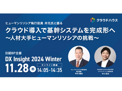 大企業向け人事労務DXクラウド『クラウドハウス労務』を運営する株式会社Techouse(本社所在地:東京都港区、代表取締役:礒邉基之、以下「Techouse」)は、日経BP主催の「DX Insight 2024 Winter」にて、総合人材サービス大手ヒューマンリソシア株式会社(本社所在地:東京都新宿区、代表取締役:高橋哲雄、以下「ヒューマンリソシア社」)執行役員 井元氏と、Techouse 執行役員 クラウドサービス事業部長 中川が公開対談を実施することをお知らせいたします。