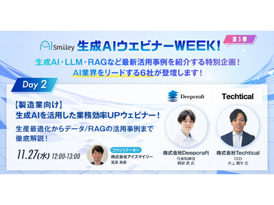 生成AI・LLM・RAGなどの最新活用事例を紹介する特別企画にて、Techticalを含むAI業界をリードする6社が登壇し、3日間にわたり様々なテーマで生成AIウェビナーを実施いたします。