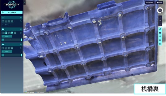 具体的には、東京都港湾局所管のフェリーふ頭桟橋や排水機場において、ドローン、カメラによる現地撮影と撮影した動画から3Dモデルを生成し、位置、寸法情報も含めた3Dモデルによる施設管理を実現しました。桟橋裏や天井の高い建物の上部についても、クラックまでしっかり3D化でき、特に桟橋裏のように確認が困難な施設外観検査において有効な手法であることが確認されました。