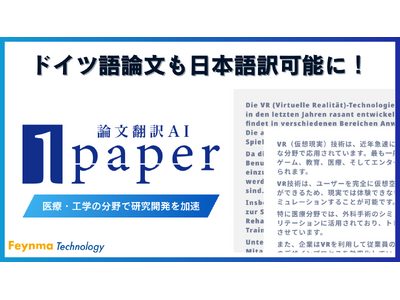 株式会社Feynma Technology(ファイマテクノロジー|愛知県名古屋市、代表 土屋太助)が提供するAI論文翻訳サービス「1paper」が、英語に加え、ドイツ語への対応も開始いたしました。専門用語も正確に翻訳し、研究者の皆様の作業効率を大幅にアップさせます。ただいま無料トライアルを実施中ですので、この機会にぜひお試しください。