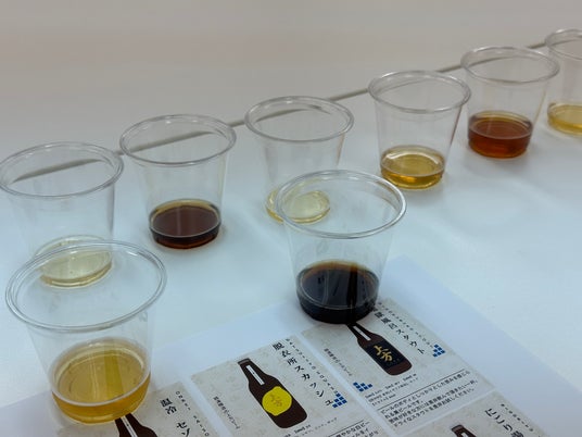 【1】開発会議という名の試飲会味の方向性を決める開発会議は総務・経理の社員を中心にメンバーを選出。上方ビールの志方代表に来ていただきビールのスタイル(種類)の説明や上方ビールさんのラインナップを試飲。作るビールのスタイル、テイストを決定。