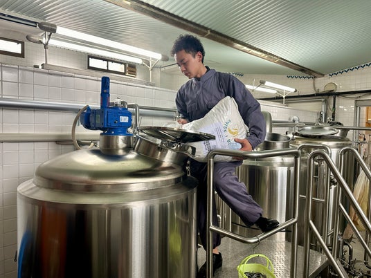 【3】醸造の仕込み作業醸造の仕込み作業は機械設備保守の社員を中心にメンバーを選出。麦芽の粉砕からホップの投入まで全工程に携わりました。
