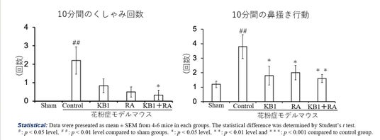 図1 乳酸菌KB1株、ロスマリン酸(RA)、KB1+RA併用による花粉症モデルマウス行動の変化(発表内容より一部抜粋)