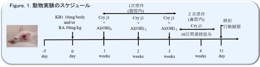 本研究では、5週齢のBALB/cマウス(日本クレア)にスギ花粉の主要なアレルゲンであるCry j1を感作したスギ花粉症モデルマウスを作製しました。モデルマウスにKB1及びロスマリン酸を投与し、マウスの行動や脾臓における免疫調節に関わる遺伝子の発現量に対する効果を解析しました。