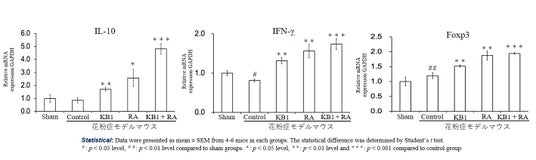 IFN-γはナイーブT細胞のTh2細胞への分化を抑制し免疫をTh1優位とする機能が知られています。また、IL-10は免疫の抑制に関与するタンパク質で過剰な炎症を抑制する効果が有り、Foxp3は免疫抑制に中心的な働きをする制御性T細胞の指標となる遺伝子マーカーです。これらの遺伝子発現はKB1投与群、RA投与群で増加し、併用投与によって更に増加することが分かりました(図2)。