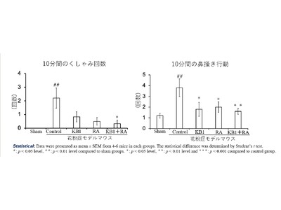 当社と北海道大学の共同研究グループは、当社が保有する乳酸菌株KB1とロスマリン酸を花粉症モデルマウスに併用投与することで、炎症応答やアレルギー症状を単独投与よりも強力に抑制することを明らかにしました。