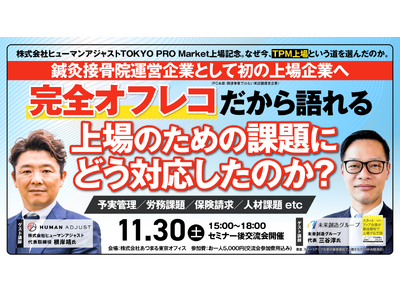 鍼灸接骨院運営企業としては、TOKYO PRO Market(TPM)で初の上場企業となる、株式会社ヒューマンアジャスト様をお迎えして、上場記念セミナーを開催いたします。