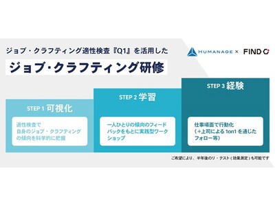 このたび、ビジネススキル・キャリア研修において豊富な実績をもつファインド・シーと、20年を超える適性検査の開発ノウハウを持つヒューマネージとの提携により、ジョブ・クラフティング適性検査『Q1(Quest One)』を活用した「ジョブ・クラフティング」研修の提供を開始します。